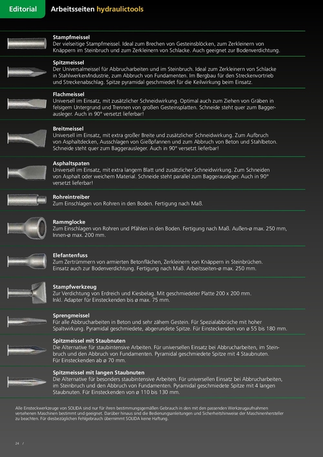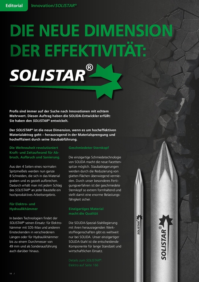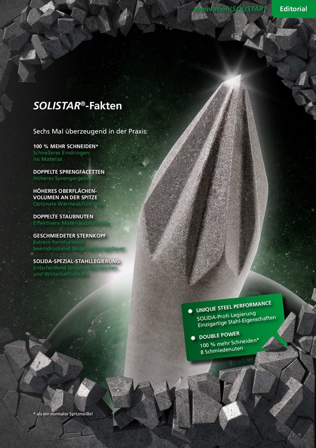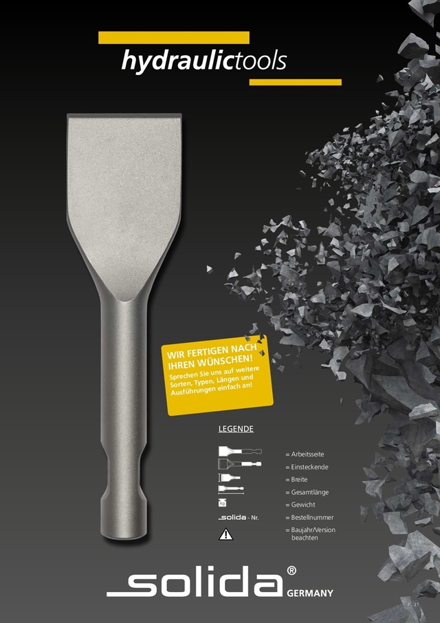 Einsteckwerkzeuge (in Erstausrüsterqualität) - aus geschmiedeten Hochleistungsstahl - für Hydraulikhämmer wie z.Bsp.: - Stampfmeißel - Spitzmeißel - Hochleistungs-Sternmeißel - Flachmeißel - Breitmeißel - Asphaltspaten - Rohreintreiber - Rammglocke - Elefantenfuss - Stampfwerkzeug - Sprengmeißel Eigenschaften und Vorzüge von der Weltneuheit SOLISTAR®: 1. Schnelleres Eindringen ins Material 2. 8 Schmiedenuten 3. Höheres Sprengergebnis 4. Optimale Wärmeabführung 5. Effektivere Materialabführung 6. Geschmiedeter Sternkopf 7. Extrem Formhaltend, beeindruckend lange Nutzungsdauer 8. Spezial Stahllegierung 9. Entscheidend längere Standzeiten und Wirtschaftlichkeit 10. Doppelte Staubnuten Der Versand erfolgt direkt durch Solida. Die Lieferzeit beträgt durchschnittlich 3-5 Werktage.